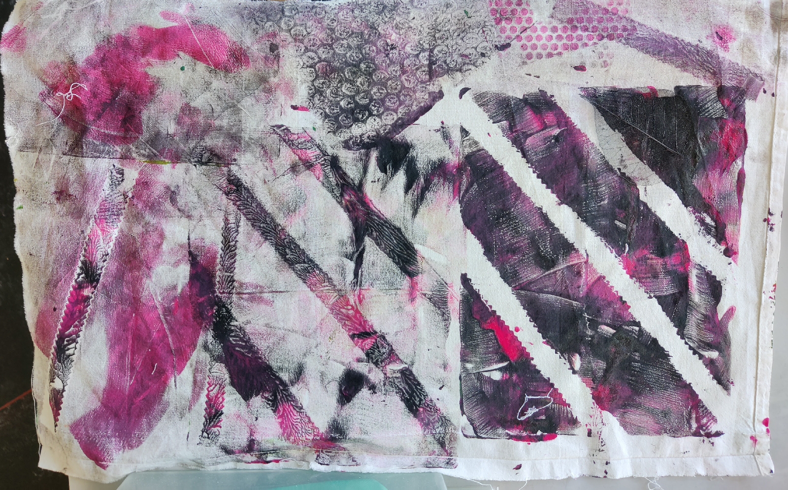 Op de lappemøte hebben we gezamelijk regenboogkleuren aan elkaar genaaid. Deze stof werd in 5 delen gesneden en onder elkaar verdeeld.